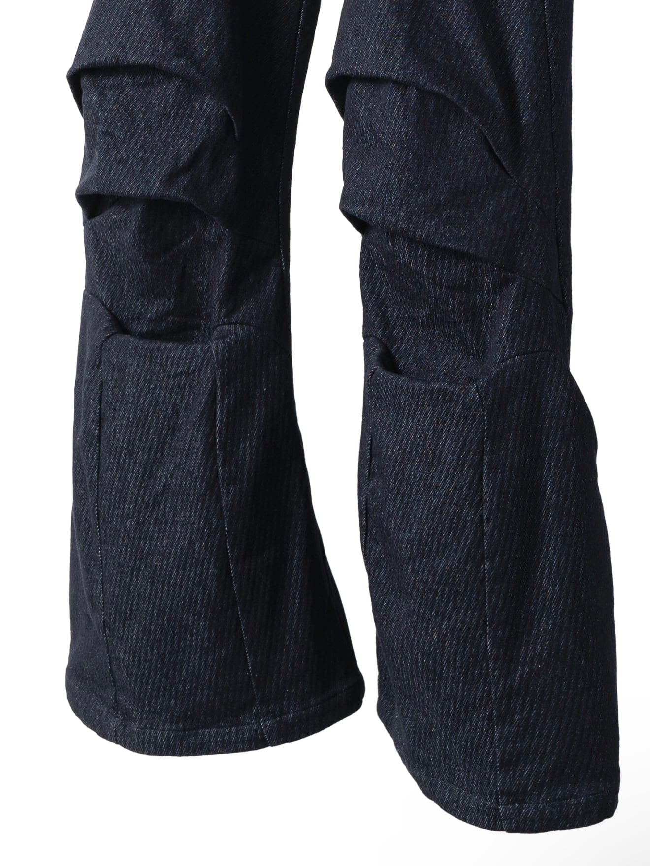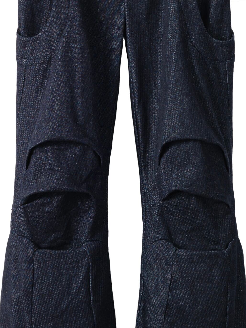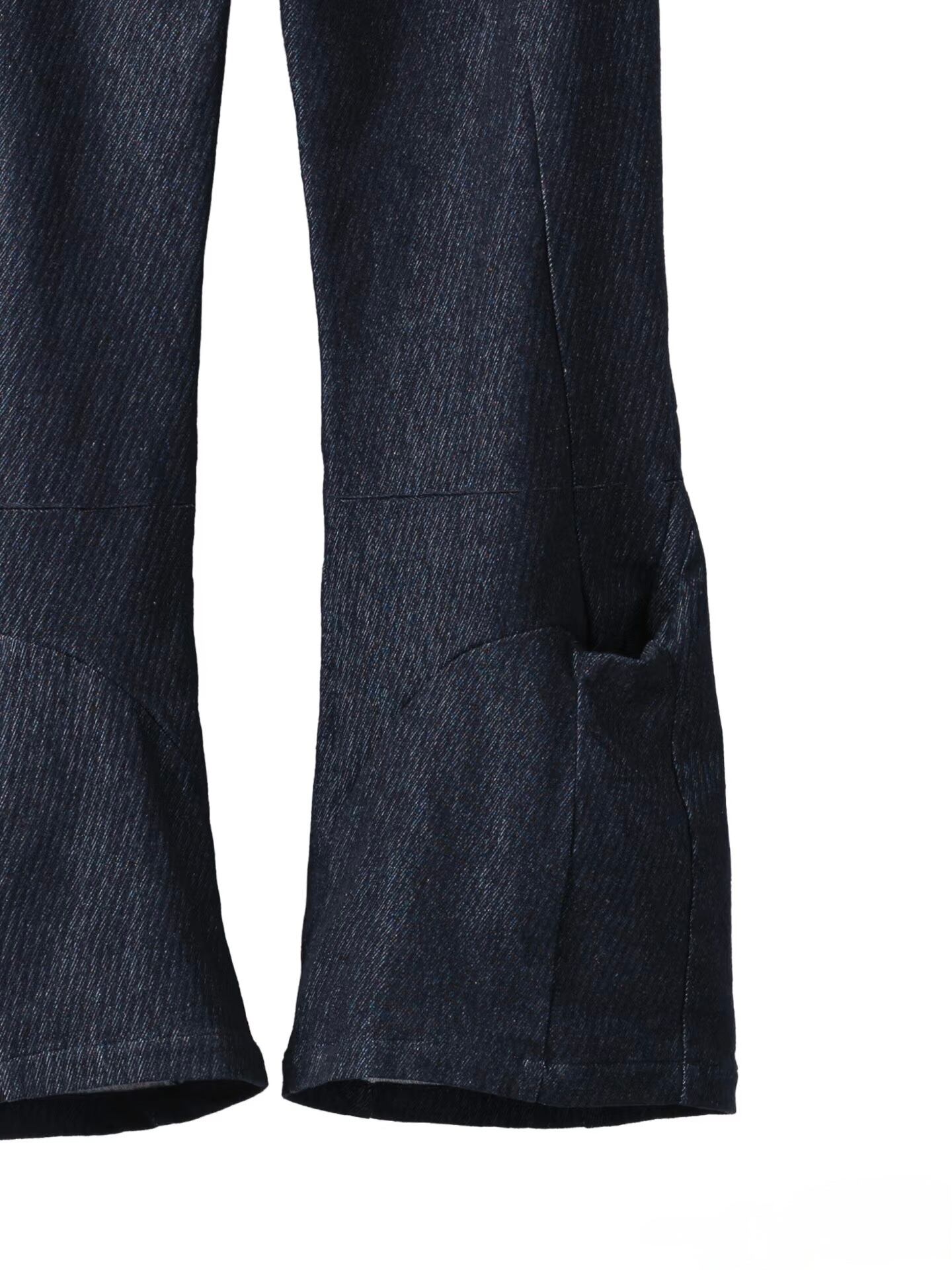 足元はフレアシルエットになっており、立体的な「岩の洞窟」のようなカッティング構造が、パンツにハリ感と構築的な造形美を与えています。