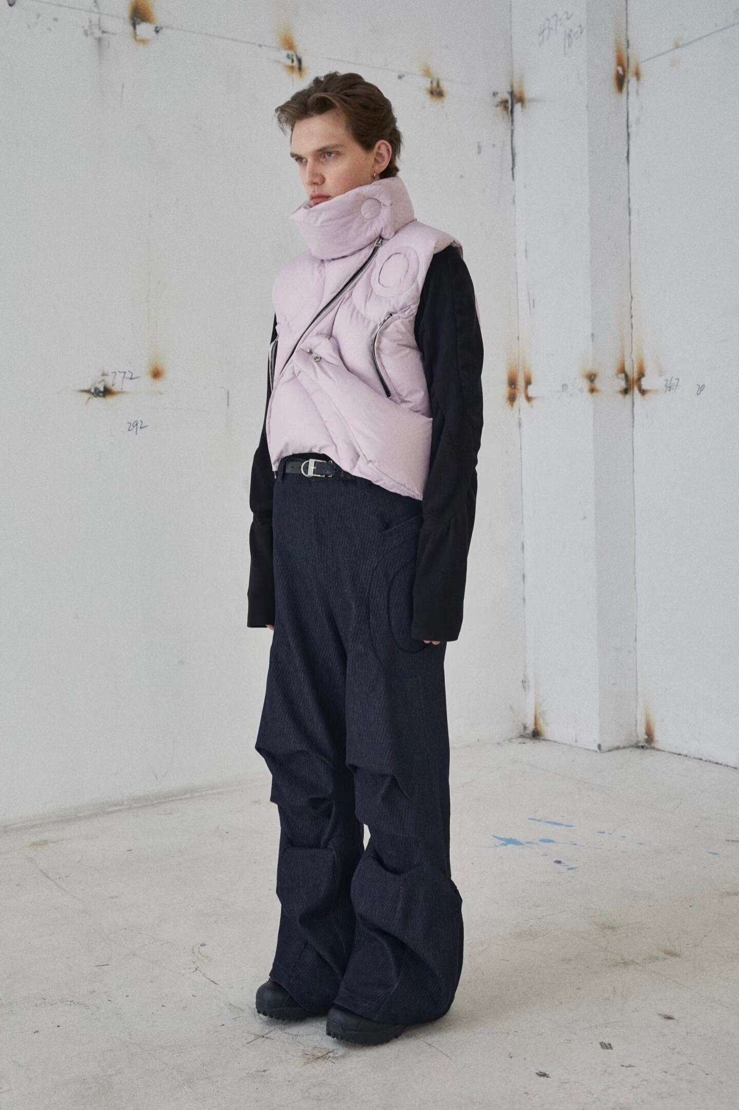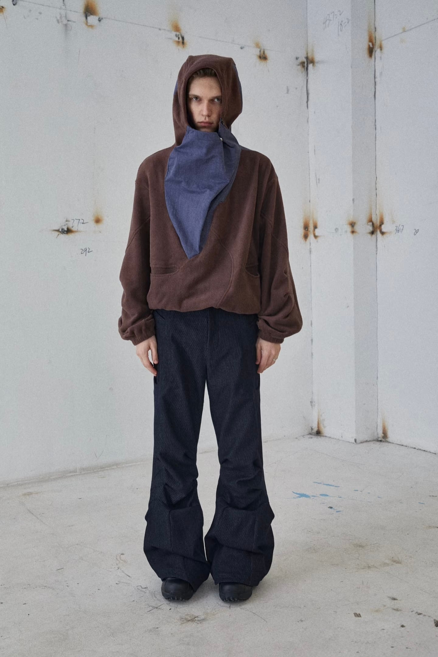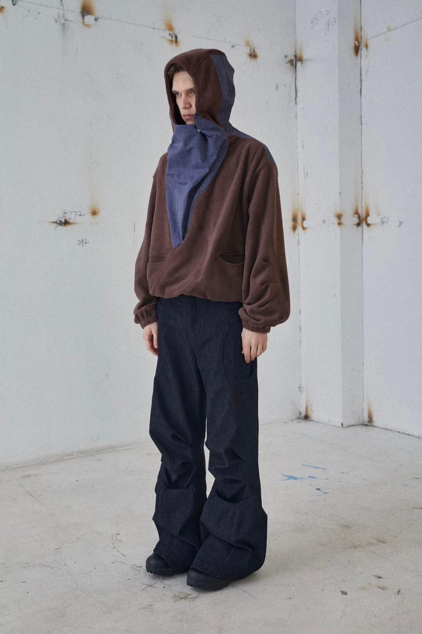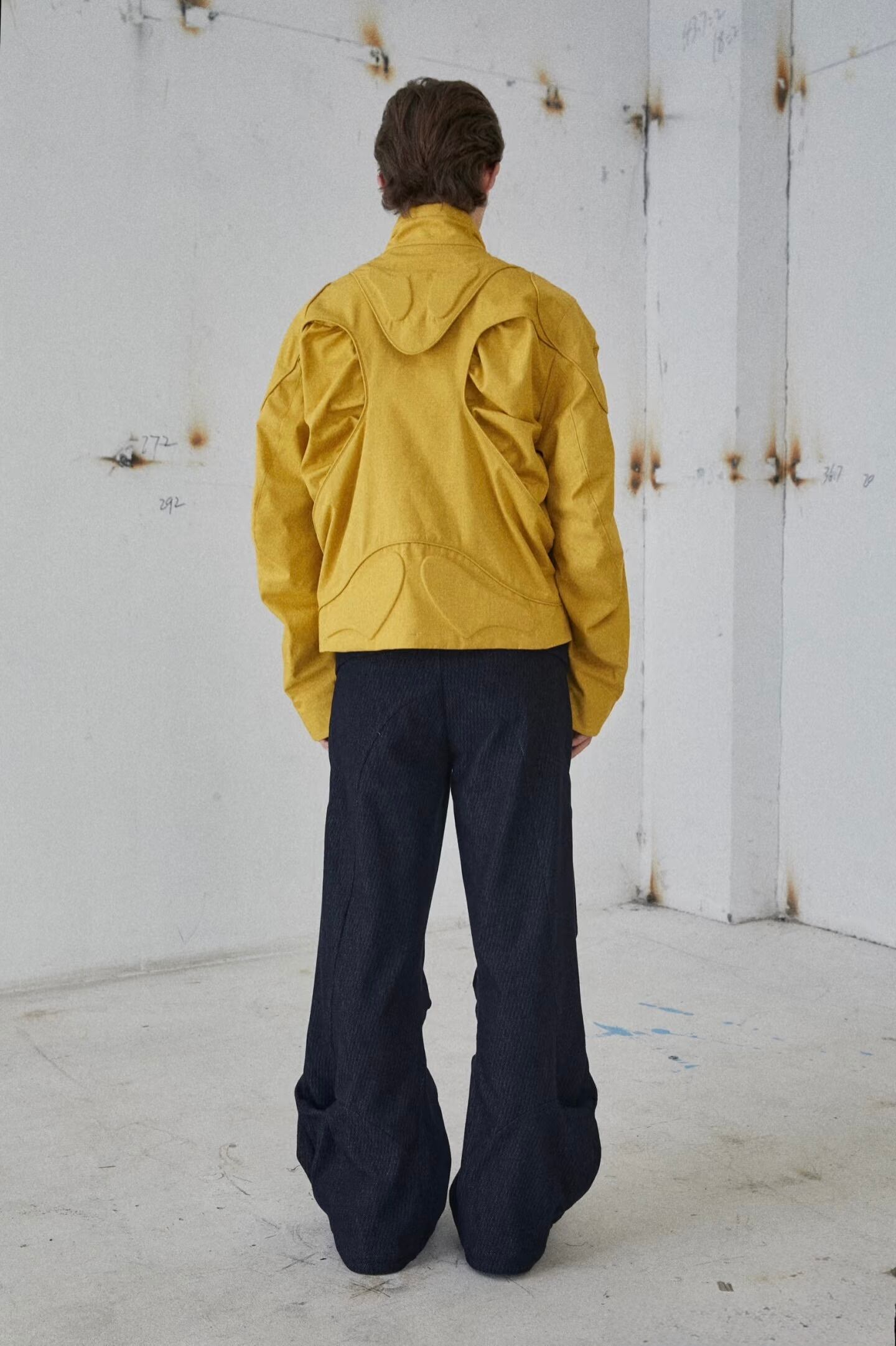 足元はフレアシルエットになっており、立体的な「岩の洞窟」のようなカッティング構造が、パンツにハリ感と構築的な造形美を与えています。